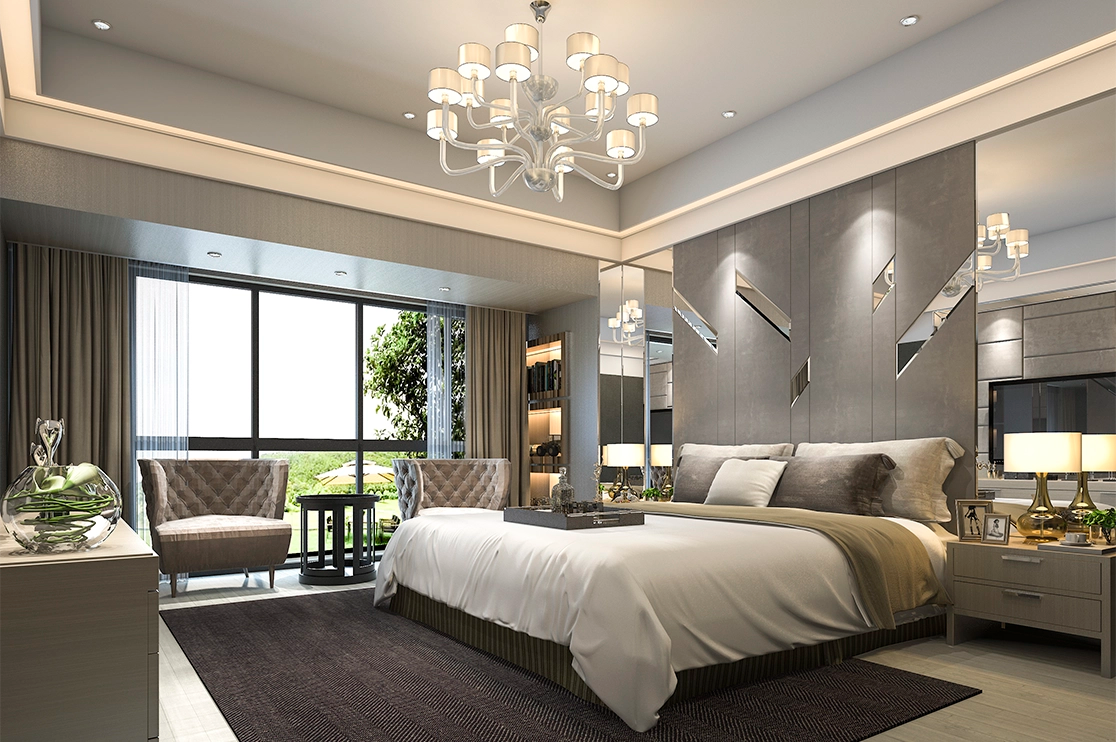 Luxury hotels rarely rely on flat paint.Premium finishes used: